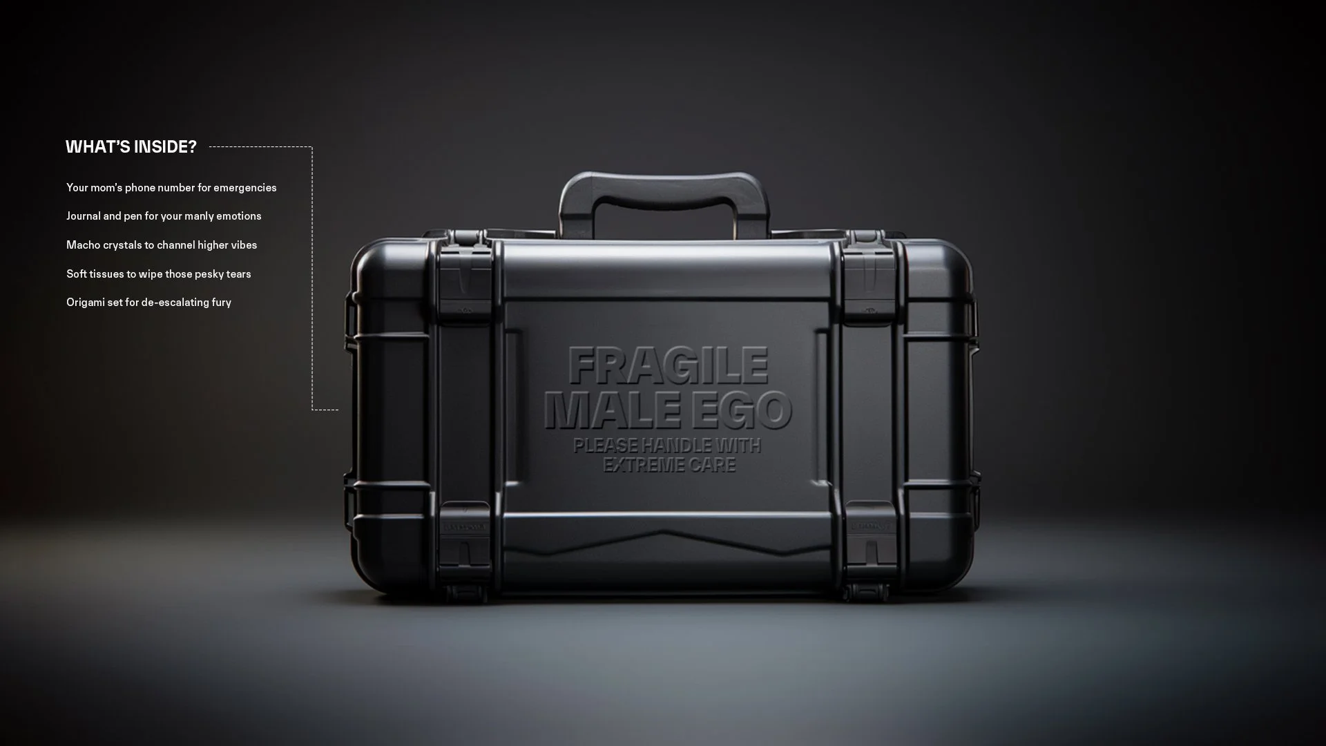 So we created a protective carrying case for the male ego, complete with all the tools a man might need to navigate a world that is no longer tailored specifically to their needs.
